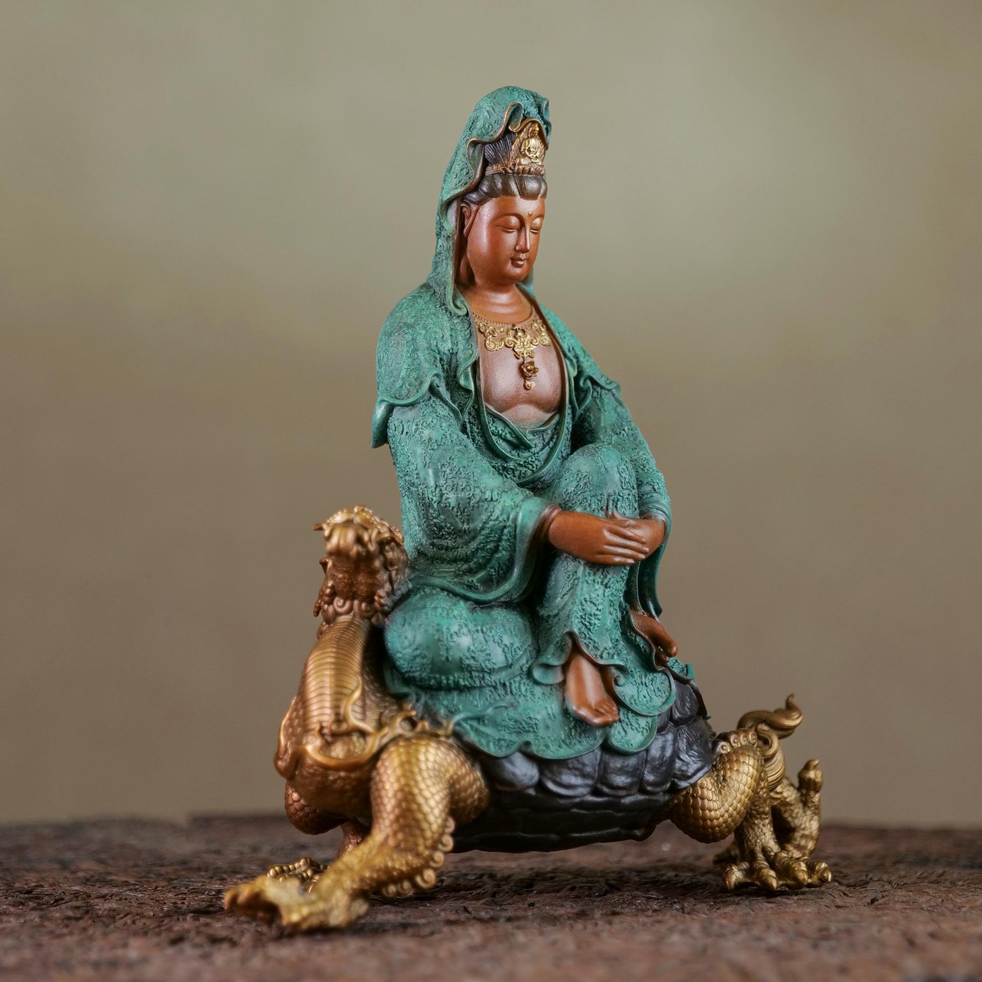 Longevity Guanyin on Loong Turtle – Handcrafted Copper Sculpture for Peace & Stability